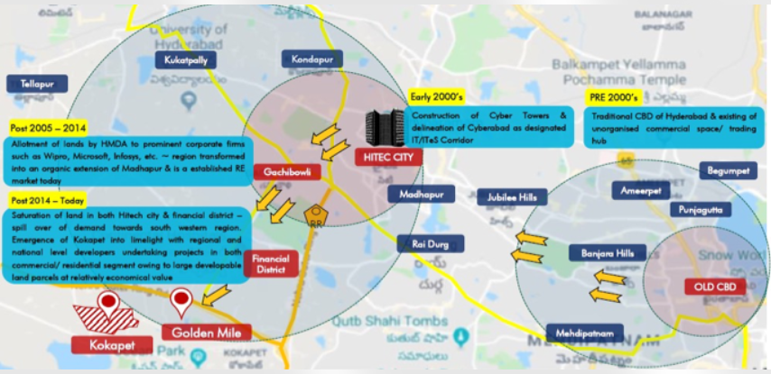 The growth has been taking a natural course of moving in the Western direction. After the burgeoning of the IT corridor, there were several residential hubs that bloomed in the peripheral areas which were Kukatpally, Kondapur, Hafeezpet and Miyapur.